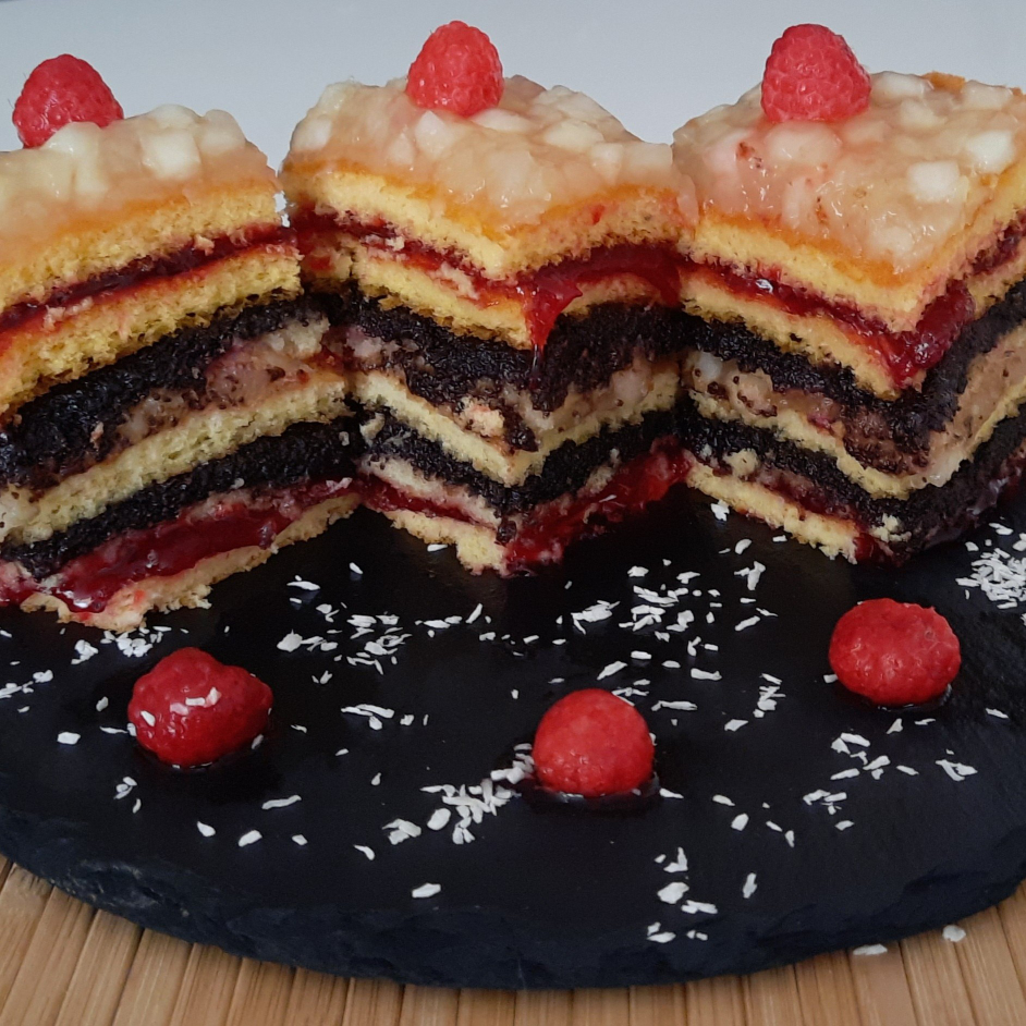 #готую Ингредиенты: макової начинки, вишневої начинки чи будь-якого червоного варення, яблучної начинки (або яблучного варення), Жменя малини, Для 3-х бісквітів, яєць, борошна, розпушувача, ванільного цукру, цукру, солі, масла для змащення Способ приготовления: Деко застеляємо пергаментом, змащуємо маслом і викладаємо макову начинку. Поверх розкладаємо малину. Для бісквіту 3 яйці перетираємо з сіллю, 120 г цукру і 1 ч. л. ванільного цукру. Додаємо 5 ст. л. просіяного борошна і 1 ст. л. розпушувача. Ретельно перемішуємо і заливаємо тістом маково-малинову начинку. Випікаємо при 180 градусах 20 хвилин. Охолоджуємо і розрізаємо навпіл. За цим же рецептом, але без маку випікаємо ще 2 бісквіти. Охолоджуємо і також розрізаємо навпіл. Загалом, у нас виходить 2 частини з маком і чотири без нічого. Формуємо наш пляцок: бісквіт без нічого -вишнева начинка -бісквіт з маком -бісквіт - яблучна начинка - бісквіт з маком - бісквіт -знову вишнева начинка- бісквіт- яблучна начинка. Залишаємо на кілька г