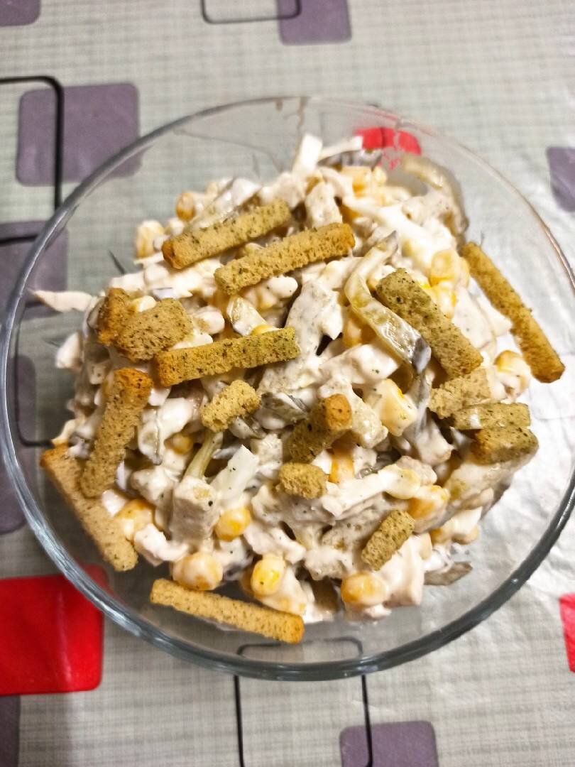 #салат #закуска #вкусно #быстро #просто #легко Ингредиенты: филе курочки, яйца, солёных огурца, кукурузы, сухариков, майонез Способ приготовления: Отвариваем филе(можно колбаску сервелат, или копченую грудку). Нарезаем соломкой огурчики, филешку, отварные яйца. Высыпаем в миску, туда добавляем кукурузу. Сухарики можно сделать самим, мне лень было. Купила со вкусом сметана-зелень. Не берите острые, чтобы сухари не брали верх по вкусу всего салата. Высыпаем к остальным продуктам. Майонез и хорошо перемешать. Очень вкусно, просто и быстро. Экспериментируйте. 😉 Если кушать не сразу будете, то сухари перед подачей добавить. Приятного Вам аппетита.