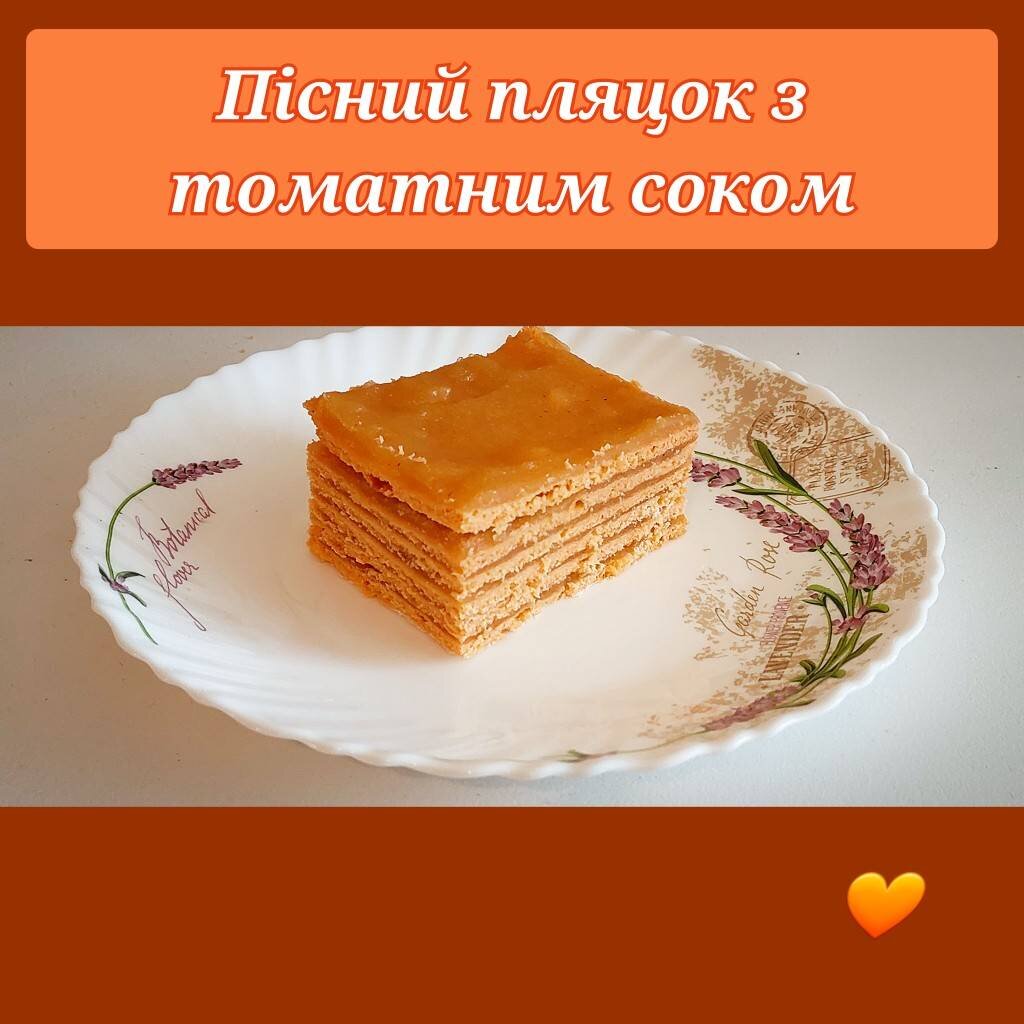 Ингредиенты: борошна, цукру, томатного соку, олії, оцту, соди, солі, Крем, соку (яблучний або апельсиновий), желе, манної крупи Способ приготовления: В томатний сік додаємо цукор і ретельно перемішуємо. Додаємо олію, сіль і соду, погашену оцтом. Всипаємо борошно, замішуємо тісто. Розділяємо на 6 частин. Розкачуємо тісто. Випікаємо кожен корж 7-10 хв при температурі 180 градусів Готуємо крем. Для цього ставимо на вогонь сік та додаємо манну крупу. Варимо до загустіння (5-10 хв) В кінці додаємо желе, перемішуємо. Залишаємо крем охолонути. Складаємо коржі, змащуючи кожен кремом. Залишаємо на 7-10 годин у холодному місті. Далі вже можна куштувати.Смачного🍰