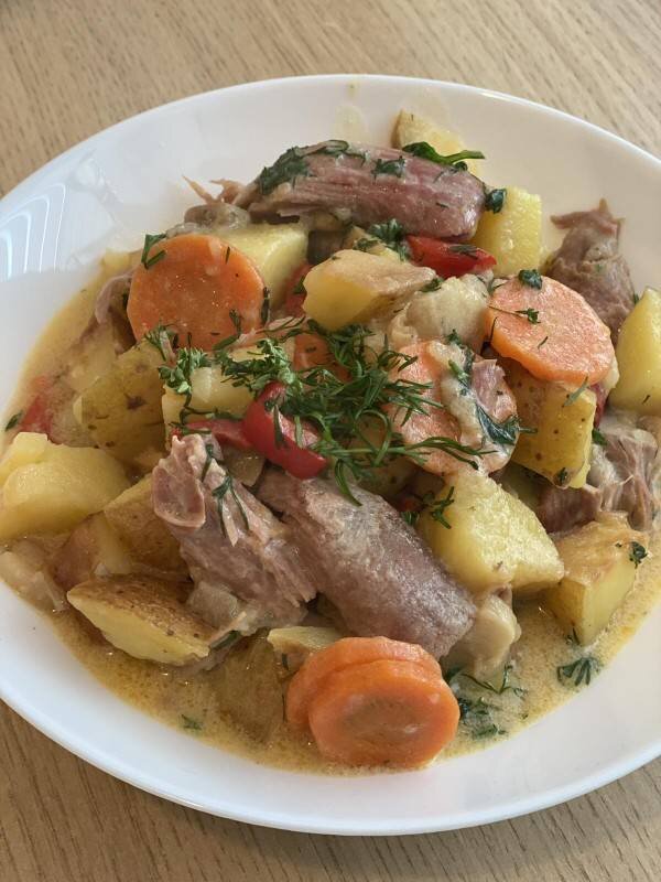 #жарке #картопля #обід #смачно #готовимдома #готовимслюбовью #готуємо #смачно #смачновдома #готуємозлюбовю #картоплязмясом Ингредиенты: картоплі, сала копченого, цибуля, морква, червоний перець, печериць, індичого бульйону, сметани, індичого м'яса, борошна, зелень за смаком укроп, петрушка, сіль, перець, червона паприка Способ приготовления: Для початку відварити індичку. Я взяла стегно. Варимо як звичайний бульон з додаванням овочів. Можно додати ще й кубики магі. Картоплю помити та нарвза кубиками. Смажити на сковорідці до напівготовності. Всі овочі підготувати для жаркого. Помити та почистити, нарізати. Починаємо готувати. В кастулю з товстим дном викласти шматочки сала. Підсмажуємо. Додати олію та наші овочі та гриби. Смажимо до готовності. М'ясо обваляти в борошні. Додаємо до овочів. Смажимо. Додаємо сметану. Все добре перемішати. Додаємо картоплю, бульон. При потребі сіль та перець. Варимо 10 хв. Додаємо зелень. Варимо 2-3 хв.