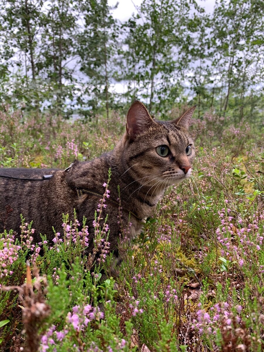 Посадили ее сразу в переноску, чтобы не учудила чего. Позавтракали, собрались и в 11 уже вышли. Нужно было пересечь озеро и пойти на мыс, до которого всего 2км. Мы направились было к нему, но на пути встретили боковую волну, которая сразу заливала на борт. Мы решили, что ещё не супер моряки и нечего тут кошкой рисковать. Поплыли ближе к берегу, чтобы ветер был попутный, а обратно возьмём на мыс уже против волны. Это, конечно, удлинило бы нам путь, но рисковать было нельзя. Заплыли в итоге в губу Оровгуба, и там нашли уютненький бережок с кувшинками. Мы остановились, чтобы дойти пешком до мыса и посмотреть, что там творится, потому что ветер усилился. А на носу обычно нормально задувает и прибивает к берегу большая волна. Взяли Марусю на ручки, одели шлейку и пошли сквозь густой сосновый лес, где вся земля укрыта мховым ковром. Вообщем с Марусей на руках 2км в одну сторону по лесу решили пока не ходить. Обратно Маруся дошла самостоятельно до лагеря. Раньше она так чётко на шлейке не ход