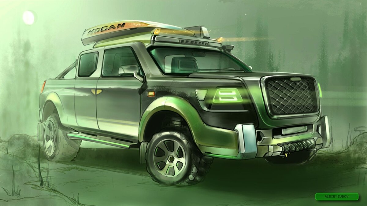 Начнём с большого пикапа с внедорожным тюнингом, который напоминает одновременно Honda Pilot (формой боковых окон) и топовый внедорожник Lincoln Aviator.