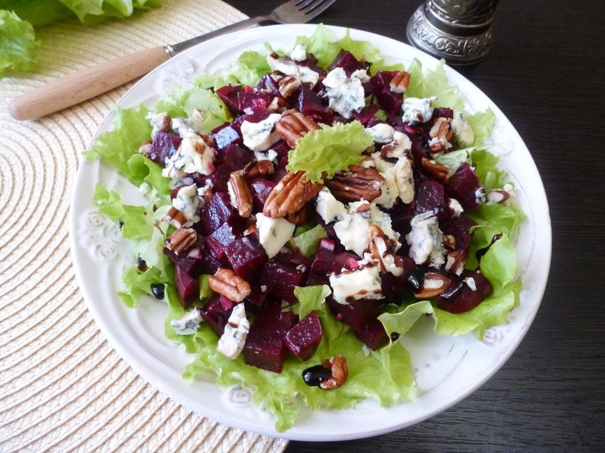 Изысканный салат для истинных гурманов. Подойдёт для романтического ужина, девичьих посиделок или домашнего торжества в уютной семейной обстановке. Ккал: 256.66, время приготовления: 20 мин., порций: 2 #Салаты и закуски #Европейская #Блюдо ПП #На ужин #Просто приготовить Ингредиенты Приготовление: 1. Подготовить ингредиенты для салата. Свеклу сварить до готовности. Попробуйте свеклу на вкус, она должна быть вкусной и сладкой, иначе салат будет испорчен. Лучше взять молодую свеклу. Чеснок почистить, листья салата сполоснуть холодной водой. 2. Свеклу нарезать на небольшие кубики, чеснок пропустить через пресс, все смешать и полить маслом. 3. Орехи подсушить на сухой сковороде. У меня орехи макадамия, но грецкие орехи тоже подойдут. 4. Листья салата порвать на кусочки и выложить на тарелку. 5. На листья салата выложить кубики свеклы с чесноком. 6. Сыр Дор Блю ( сыр с голубой плесенью) поломать на небольшие кусочки. Орехи крупно нарезать. Посыпать свеклу сыром и орехами. 7. Посолит