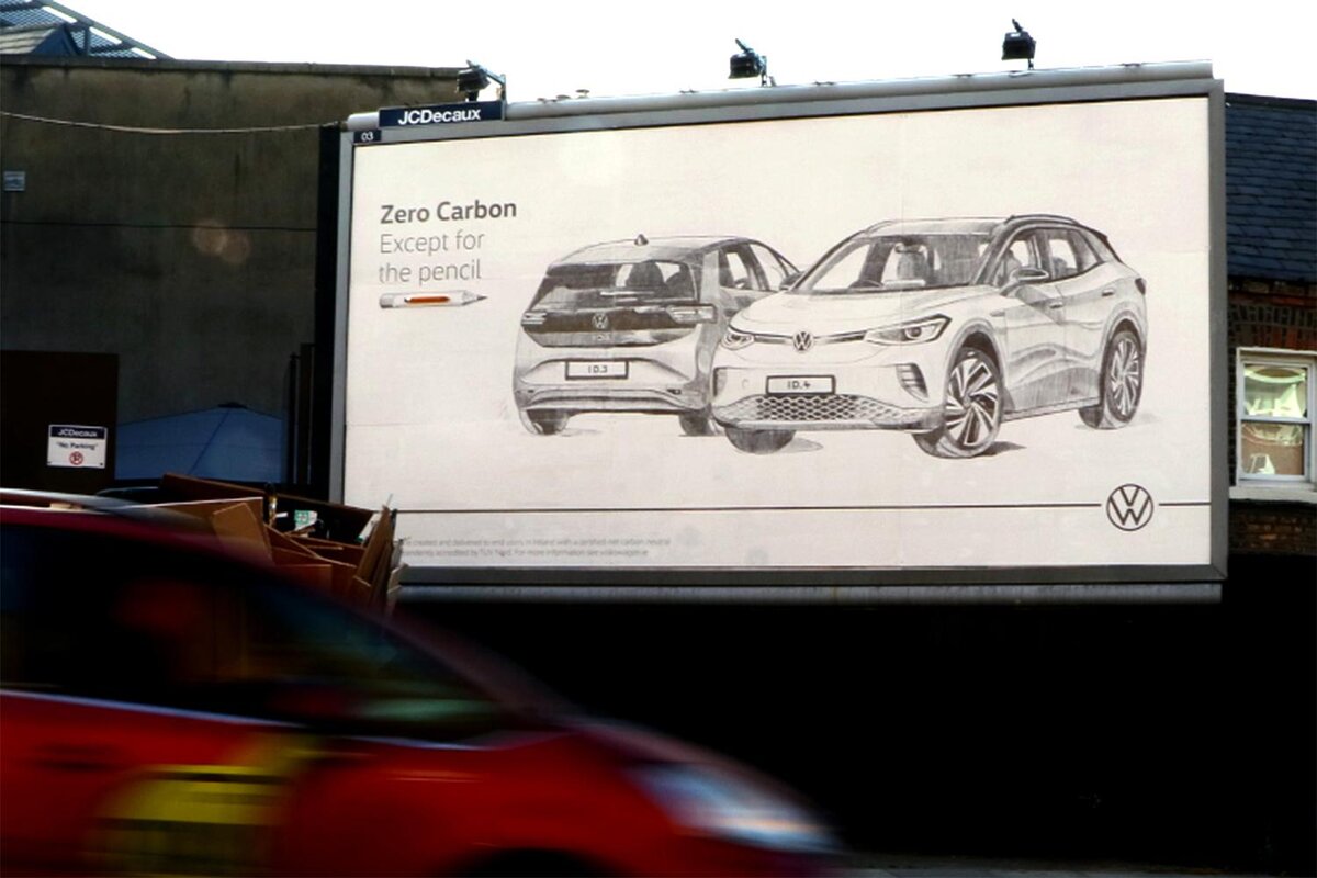 Создание экологически чистого холста заняло у художника около двух дней Ирландское подразделение концерна Volkswagen совместно с рекламным агентством BBDO установили на улице Дублина уникальный билборд с изображениями электрических ID.3 и ID.4. Необычную рекламу, посвященную нулевым выбросам батарейных моделей, нарисовал местный художник Джон Беркли. В процессе работы автор использовал обычные карандаши. Несмотря на экологичность, остается вопрос – насколько такая реклама защищена от осадков В необычной рекламной кампании специалисты решили продемонстрировать необходимость снижения уровня вредных выбросов для автомобилей. Нарисованный вручную билборд сопроводили слоганом: «Нулевые выбросы. Исключение только для карандаша». При этом электрокары Volkswagen ID.3 и ID.4 выбрали не случайно. В 2021 году батарейные модели стали самыми популярными электромобилями в Ирландии. Вместе с билбордом в Сети опубликовали видеоролик, в котором продемонстрировали процесс изготовления полотна местным х