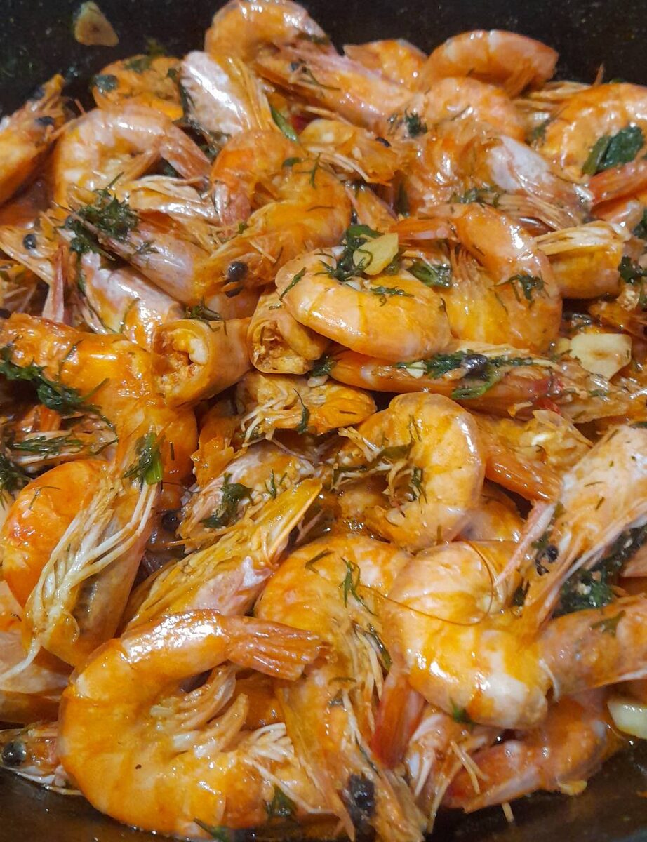 Креветки одна из вкуснейших закусок для любителей пива. Поэтому сегодня хочу рассказать вам рецепт их быстрого и несложного приготовления. Нам понадобятся: Креветки королевские – 0,5 кг. Чеснок – 4 зубчика. Масло сливочное – 150гр. Лимон – 1шт. Укроп – 1 пучок. Красный перец. Соевый соус 100 мл. Приступаем: Креветки разморозить. В глубокую сковороду, желательно с толстым дном, кладем масло и чеснок. Чеснок не режим, а давим ножом. На медленном огне поджариваем чеснок с двух сторон для того чтобы масло приобрело приятный чесночный вкус и аромат. Достаем чеснок из масла. Кладем в масло креветки, приправляем красным перцем и соком лимона. Перец и лимон кладите в зависимости от ваших предпочтений к кислому и острому. Добавляем соевый соус. В процессе приготовления креветки дадут сок – это нормально, он частично выпарится. Готовим 7 минут под крышкой 7-10 минут без нее. За 3 минуты до готовности добавляем мелко нарезанный укроп и ранее обжаренный чеснок. Если в сковороде останется жидкост