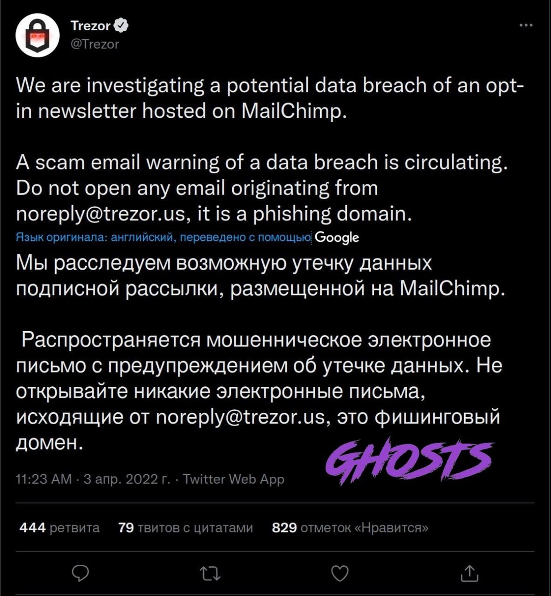Просит пользователей не открывать никакие письма от компании Trezor и иных: