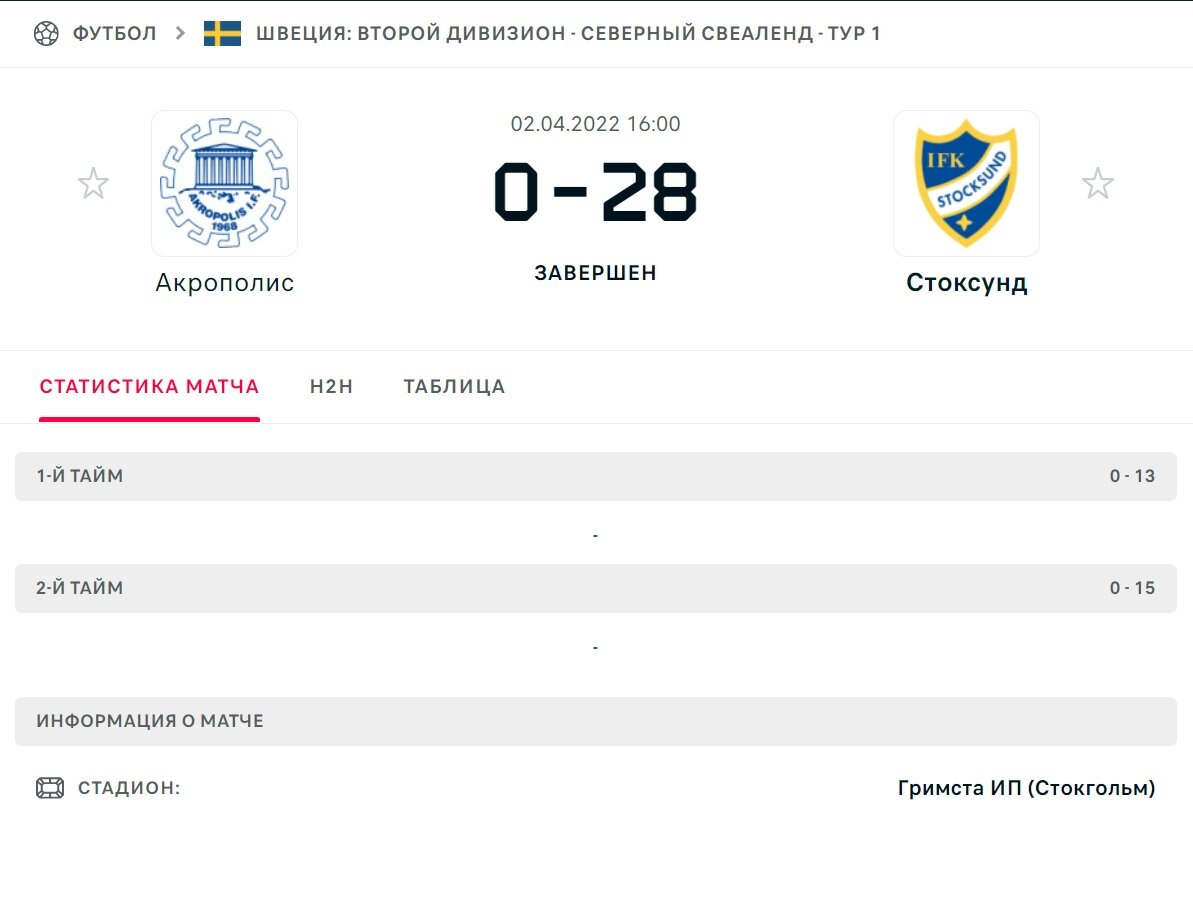 Во втором дивизионе Швеции команда "Акрополис" проигрывает 0-28 команде "Стоксунд" И это был первый тур чемпионата.