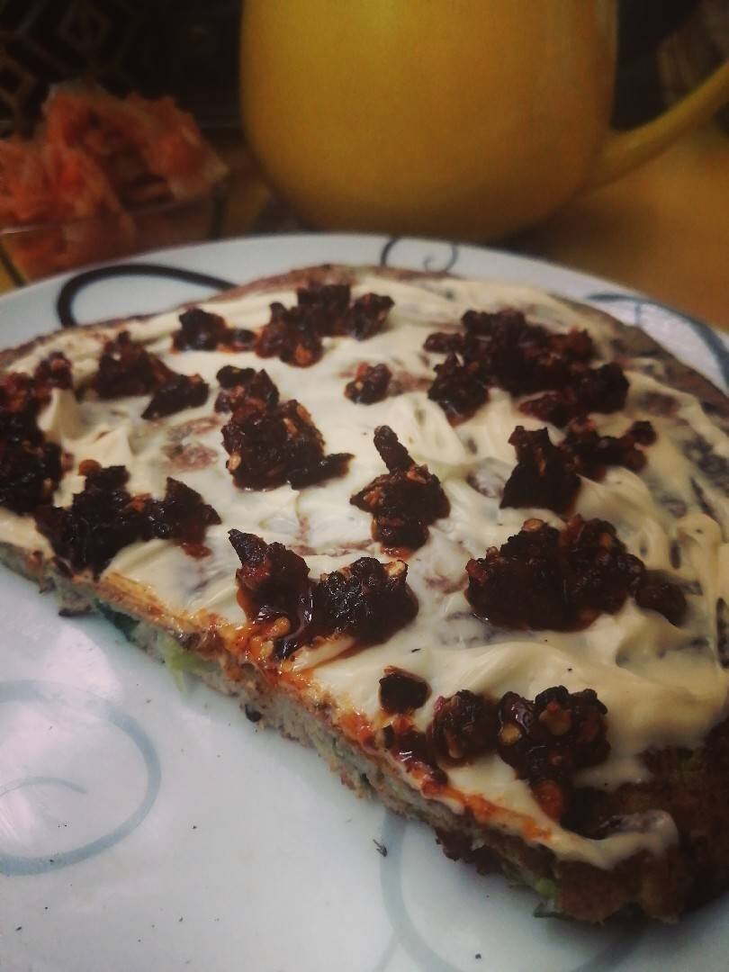 В стиле окономияки. Ингредиенты: яйцо, кокосового молока, Ржаная мука, свежего зелёного лука, Соль, Сахар, Черный тмин, зелень, Майонез, Хрустящий чили Способ приготовления: Готовим тесто как на блины: яйцо взбиваем венчиком с щепоткой соли и молоком, добавляем 2-3 щепотки сахара и специи по вкусу. Засыпаем нарезанный свежий зелёный лук, перемешиваем, далее добавляем муку до желаемой густоты. Я обжаривала в мелкой чугунной сковороде под крышкой всю смесь разом на слабом огне. Блинчик получается пышный и под крышкой успевает полностью пропечься. Переворачиваем как подрумянится и без крышки обжариваем вторую сторону. Для подачи смазываем майонезом и сверху в данном случае добавила острый соус с хрустящим перцем чили Lao Gan Ma. Замечательно подходят в качестве альтернативы жареный лук или стружка бонито.