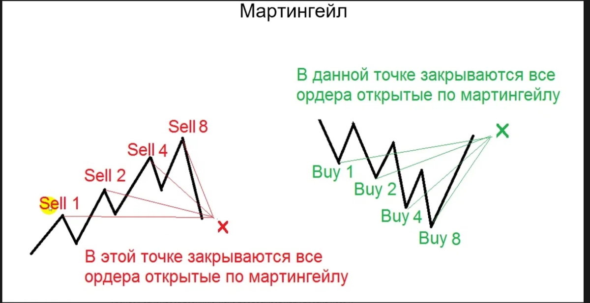Что же такое этот мартингейл, который многим хочется использовать в торговле, но не каждый умеет с ним работать? Читаем! Под мартингейлом (англ. Martingale) понимается форекс стратегия, при которой после убыточных сделок идет наращивание объема позиции с целью покрытия убытков и получения прибыли. Схематично это может выглядеть так: Трейдер открывает позицию, цена продолжает идти против него и увеличивается убыток. Далее открывается ещё один ордер с увеличенным объемом лота. При дальнейшем движении цены против трейдера все действия повторяются — открываются через определенную дистанцию новые ордера с большим размером лота, чем предыдущие. Как правило, цена не движется долго в одном направлении, наступают откаты и коррекции — и самые жирные ордера в таком случае приносят очень неплохой профит — в одной точке закрываются все сделки и на счете фиксируется прибыль (в денежном эквиваленте это может быть так: первый ордер минус 300$, второй ордер 0$, третий ордер 400$, четвертый ордер 800$ =