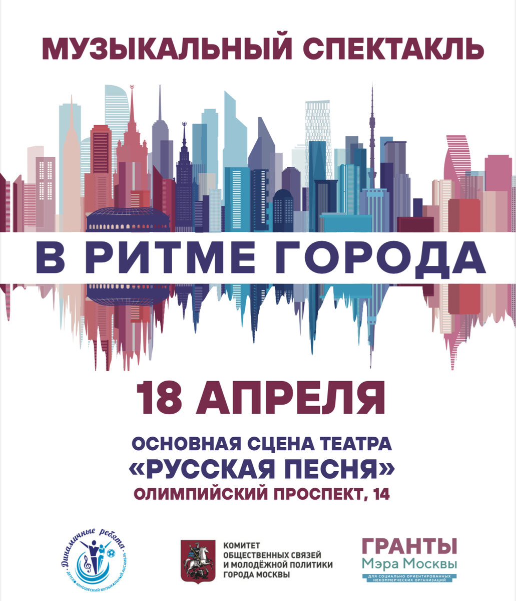 18 апреля 2022 года в театре «Русская песня» пройдёт музыкальный спектакль «В ритме города»! Проект реализуется при поддержке Грантов Мэра Москвы. Действие происходит в одном из московских дворов. Молодая девушка Наталья из провинции приезжает в Москву. Она должна подменить родственницу на посту Консьержа во время отпуска. Одновременно после длительного отсутствия домой возвращается другая девушка - Ольга. Ее сердце было разбито нелепой ссорой с любимым человеком. Чем завершится эта непростая история? Смогут ли девушки найти своё счастье? Какие приключения закружат их в ритме города? Ответы на все эти вопросы вы сможете найти в одноименном спектакле! Зарегестрироваться можно на официальном сайте - «Динамичные ребята» Спешите, количество мест ограничено!