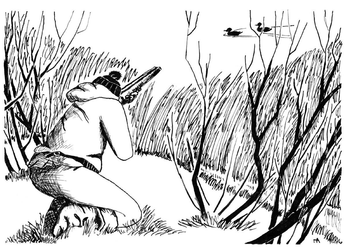 Обошел почти все «верные места» на старицах. Нет уток. Несмотря на это настроение хорошее - ясный, тёплый, с ласковой лёгкой грустинкой осенний день прекрасен. Век бы ходил! – На реке, что ли, посмотреть? Иду берегом Ика по обрыву. Что-то впереди привлекает моё внимание. В бинокль вижу: на отмели у песчано-илистой косы кормится табунок уток, похоже, чирки. Коса густо поросла тальником, можно будет подойти на выстрел. На противоположной стороне реки, напротив уток, откуда-то из-за берега выныривает и почти сразу скрывается мотоцикл. – Видимо полевая дорога там к берегу подходит: утки срываются «на крыло» и, нарезав два быстрых круга, возвращаются на отмель. Пока иду к косе, по дороге протарахтела телега. Чирки уходят на знакомые уже два круга и вновь садятся на своё место. Высокие у основного берега заросли тальника на косе, ближе к воде становится всё ниже и идти в полный рост дальше нельзя. Но и ползти невозможно, - сплошная ежевика вперемешку с крапивой... Кое-как всё же двигаюсь...