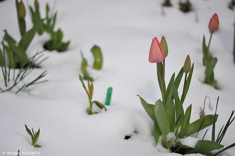Учитывая мягкий климат и экстремально теплый конец марта (днем температура достигала + 18°С), апрельские заморозки и снег стали испытанием для весенних цветов и только распустившейся листвы. Ну как так? Тюльпаны только собрались цвести, и сразу оказались в снегу. Впрочем, в них я уверен - они стоически переносят заморозки. Особенно, тюльпаны Грейга. Думаю, ничего не случится и с нарциссами. Температура опускалась до -4°C, но всего на пару часов. Это не катастрофическая ситуация - должны выстоять. Более того, мне показалось, что белоснежному нарциссу Thalia снег даже к лицу - очень красиво и нежно он выглядит на белом фоне. Вообще белое на белом, оказывается, смотрится очень хорошо. В подтверждение тому - гиацинты. Мускари тоже храбро торчат из снега и совсем не реагируют на столь заметное похолодание. Но не все растения так легко переносят морозец. В прошлом году подобными заморозками у меня снесло под корень клематис Diamantina, который стоял в бутонах. Памятуя об этом и глядя на буто