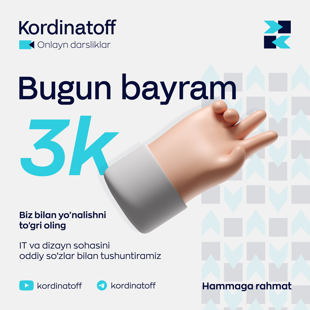 🔸 Assalomu Alaykum ⠀ 🔸 Bugun 👉 Kordinatoff kanalimizda biz uchun katta bayram balki kimdur uchun bu kichik bir natijadir balki 💥 3 000 kichik son deyishingiz mumkin ammo bu biz uchun bir boshlang'ich g'alaba🔥 ⠀ ☁️ Bunda albatta sizlarni e'tiboringiz va ajratayotgan vaqtingiz katta ro'l o'ynaydi. 😊 Shuning uchun birinchi navbatda sizlarga rahmat.🙏🏻 ⠀ 👉 Kanalimiz ochilganiga bir yarim yil bo'ldi. Shu oraliqda erishgan natijalarimiz ⠀ 🔸 30 ga yaqin obunachilarimiz freelance birjaga (work-zilla.com) kirib kelishdi 🔸 Videolarimizning umumiy ko'rishlar soati 3 600 soat 🔸 Eng ko'p ko'rilgan darsligimiz ko'rilishlari 16 700 ga teng 🔸 Bilgan bilimlarimiz bilan ulashib do'stlarimizga moliyaviy erkinlikga erishishga yordam bermoqdamiz ⠀ 👉 Biz bilan qolganingiz va qo'llab quvvatlayotganingiz uchun katta rahmat ⠀ #kordinatoff #vebdizayn #webdizayn