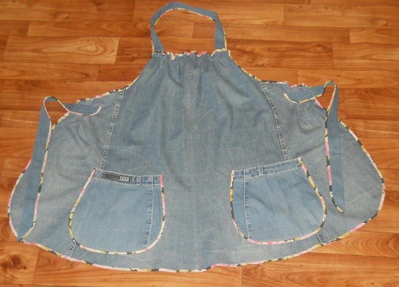 Как из джинс сделать фартук. Распороть штанины по шву без отделочной строчки, из получившихся полотнищ выкроить основу фартука. Карманы и пояса можно выкроить из этих же джинс, если они были достаточно широкими. Обработка руликом карманов, поясов и края изделия делают детали тоньше и все изделие легче в обработке. В этом фартуке для поясов пробиты петли, в которые вставляются пояса из готовой плотной тесьмы. Количество карманов ограничено только площадью фартука и вашей фантазией. Для карманов и поясов можно использовать контрастный материал, который есть под рукой. Фартук получается тяжеловатым и подходит скорее для работы в саду, с глиной или чем-то горячим, так как плотная ткань надежно защищает. Фантазируем и творим полезные вещи для себя и своих близких.