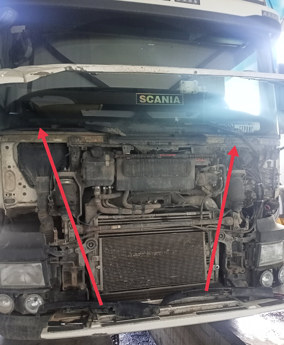 Доброго времени суток, примерно неделю назад после удачных выходных прихожу на работу, а тут мне с порога босс говорит "тебя там скамейка заждалась с подвеской" ну мы не гордые быстренько переодевается и в бой так сказать. Имея хоть малое понимание ну и естественно инструмент перебрать подвеску не составит труда. Для начала скидываем пластик на дворниках (во избежание проблем) Откручиваем перед торсионном пластину гайки болты на 16 если не ошибаюсь (в моем случае была солянка из всего подряд) Откручиваем верхние гайки амортизаторов ключ 18 и в самой шпильке под шестигранник, что бы не крутилась вместе с гайкой Подъёмником немного приподнимает кабину для удобства доставать амортизаторов Откручиваем из торсиона нижние болты амортизаторов и успешно достаем их Вставляем что-нибудь подлинней и покрепче как на данном фото что бы вывесить кабину на тельфер и подъемник можно опустить что бы кабина села на замках сзади. Приподнимаем слегка и можно откручивать сам торсион болты на саленбл