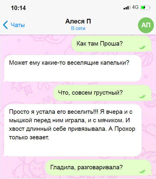 Да, да, нашим питомцам тоже бывает грустно. Мы, хозяева, при этом готовы почти на всё, чтобы развеселить питомца. Чтобы только не видеть эти большие печальные глаза, не слышать вздохов... Сегодня для Вас - подборка именно таких переписок, о собачьей и кошачьей грусти. А так же о том, как с этим боролись хозяева. А уж получилось или нет, судите сами. Ну, хоть поглаживания коту Прохору понравились) Дело было в феврале. У Проши была "предмартовская грусть", кошачий "кризис среднего возраста". Помогла, в результате, обычная лазерная указка. Разыграли кота. Сейчас Проша с удовольствием смотрит в окно, комментируя события хриплым мяуканием и шкодит по дому. На радость хозяйке. Еще одна переписка о грустном мопсе Тимохе. Мопсик здоров, но немного... пухловат. Ему снизили норму питания, а хитрый Тима решил снизить расход калорий. Экономия энергии) А то вдруг похудеет! Наши питомцы иногда так легко нами управляют с помощью грустных глазок! Теперь переписка о деревенской собаке Ляльке. Собака с