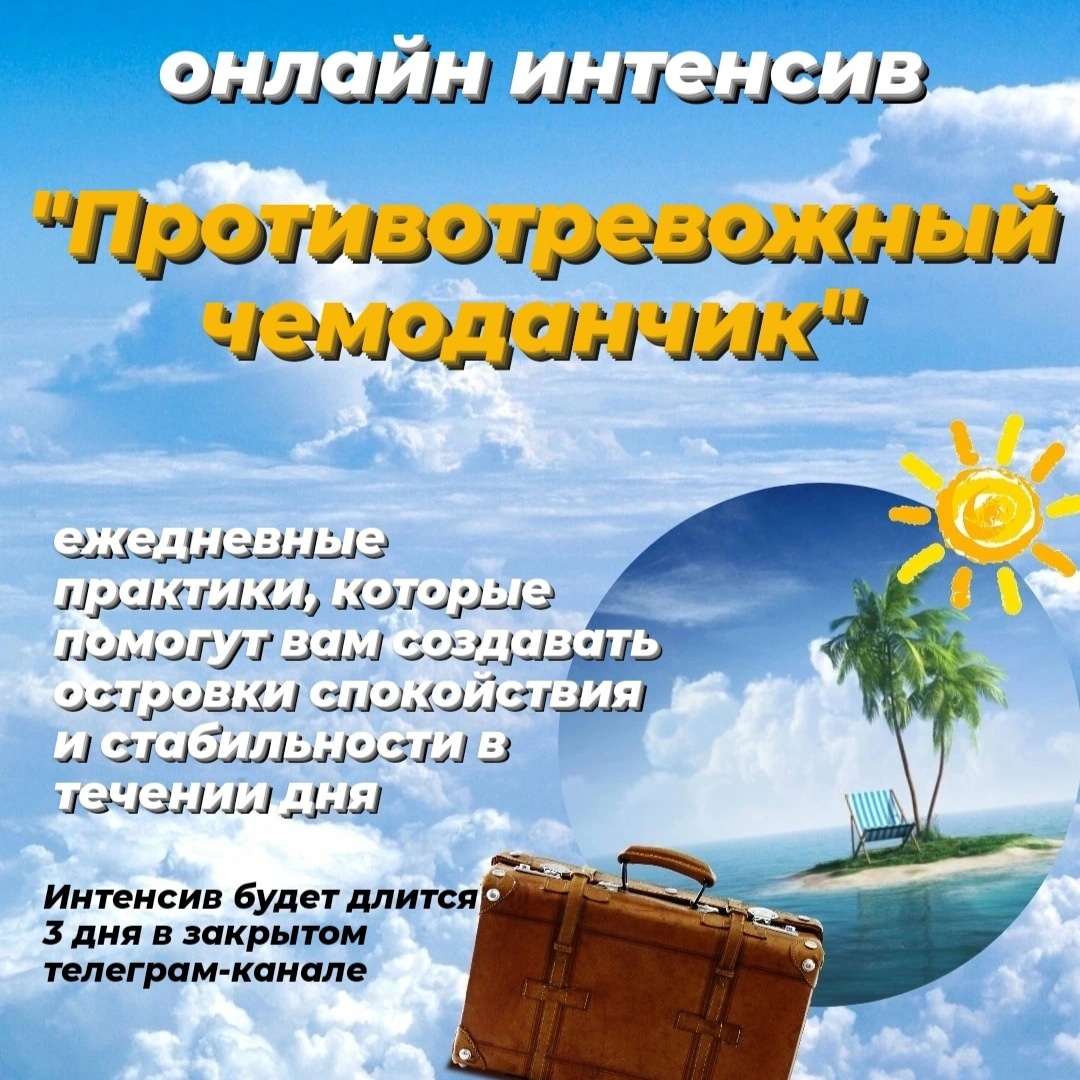 Приглашаю вас участвовать в онлайн интенсиве "Противотревожный чемоданчик". Ежедневные практики, которые помогут вам создавать островки спокойствия и стабильности в течении дня. Старт 15 апреля! Интенсив будет длится 3 дня в закрытом телеграм-канале. На протяжении каждого дня вам будут предложены 4 разные психологические практики, по одной на утро, день, вечер и отход ко сну. Что вы получите: ✅12 психологических практик по арт терапии, метафорическим ассоциативным картам, дыхательные и телесные техники, медитации; ✅ методическое пособие; ✅ общение и поддержку в чате; ✅ бессрочный доступ к телеграм каналу с интенсивном. Ожидаемые эффекты от онлайн интенсива: ✅ снижение тревожности; ✅ гармонизация эмоционального состояния; ✅ самопознание, вы сможете открыть себя с новой стороны; ✅ обнаружение своих скрытых ресурсов; ✅ развитие творческого потенциала. Как всё будет обстоять: Я буду присылать задания в течении дня, вы можете выполнять их в удобное время, и присылать свои наблюдения,