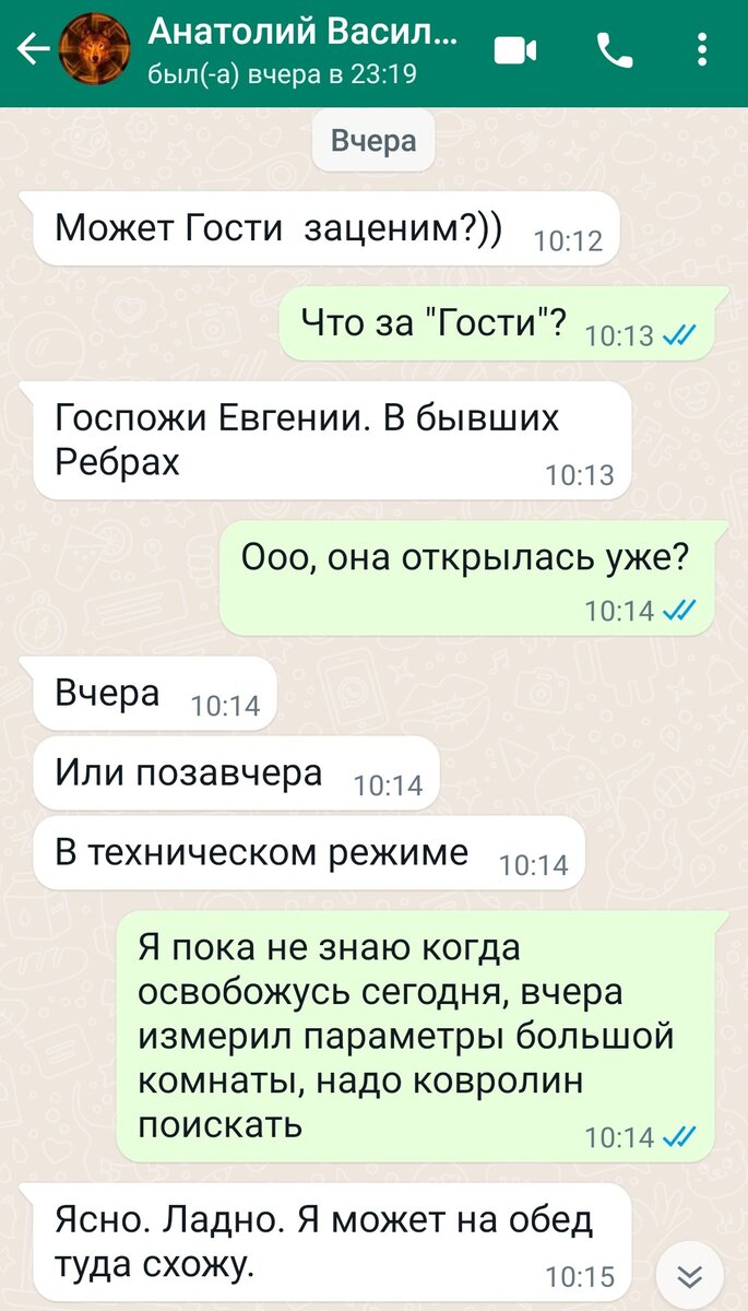 Опосля планы были грандиозные - позавтракать яишенкой и отправиться в один из оставшихся на рынке гипермаркетов строительных материалов. Но как всегда невовремя оживился вражеский WhatsApp - Анатолий Васильевич горел желанием первым сообщить, что "любимая" ресторатор голодного великана и злобного старикана Евгения Левандовская открыла очередной грузинский ресторанчик.