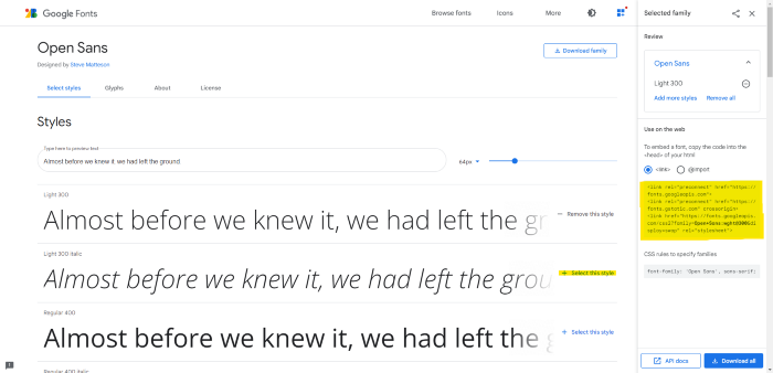 Это бесплатный сервис, с помощью которого можно подключать шрифты, но не хранить их на своём сервере. Чтобы им воспользоваться, необходимо выбрать шрифт и добавить одно или несколько нужных начертаний, а затем вставить в <head> ссылку, которую сгенерирует Google Fonts во вкладке Embed.