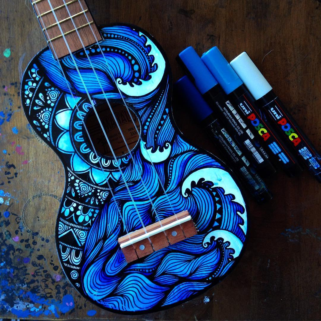 Австралийская художница Солти Хиппи (Salty Hippie) в своём творчестве совместила две главные страсти – музыку и рисование. Девушка виртуозно расписывает гитары, бубны, барабаны и многие другие музыкальные инструменты. Чаще всего она выбирает приятную морскую гамму оттенков. Солти Хиппи очень любит рисовать на укулеле (маленьких гавайских гитарах). Довольно часто на их поверхностях художница выводит цветочные и морские узоры. Из всех материалов она предпочитает яркие маркеры. Среди сюжетов этих маленьких произведений искусства подавляющее большинство относится к природной тематике. Всю свою жизнь девушка провела в Сиднее. Вероятно, именно поэтому она настолько близка к натуральности и естественности в своём творчестве. Помимо росписи музыкальных инструментов, Солти изредка разрисовывает небольшие статуи, создаёт авторские украшения, а также занимается живописью. Если верить выдержкам из интервью с художницей, её мечта – разрисовать банджо. Всё, что выходит из-под талантливых рук Хипп