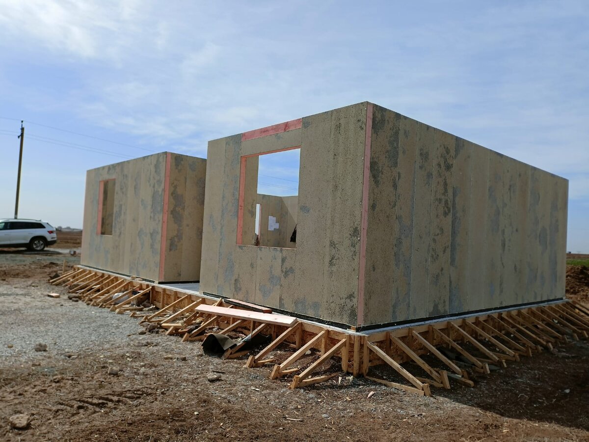 Добрый день, друзья! Возвели стены дом из СИП панелей в Сакском районе Крыма, в селе Уютное, что на окраине Евпатории. Заказчики приобрели участок в новом поселке, там еще абсолютно чистое поле, на участке заказчиков нет даже электричества, но в скором времени обещают. Место перспективное, участок ровный земля плодородная, климат прекрасный, море и крупный город Евпатория со всей соответствующей инфраструктурой, всё рядом. Заказчики давно наблюдали за нашей деятельностью и как только появился участок сразу обратились к нам, выбрали проект, наши архитекторы изменили его согласно пожеланий заказчиков, напоминаю, это бесплатно. По мере того как позволила погода, залили наш бетонный облегченный фундамент и когда он набрал прочность, привезли домокомплект. Монтаж стен занял всего два дня! Следующий этап, крыша и кровля будет выполняться заказчиками самостоятельно, так как есть знакомые специалисты. Мы никогда не настаиваем на дополнительных опциях, все что вы можете сделать самостоятельно —