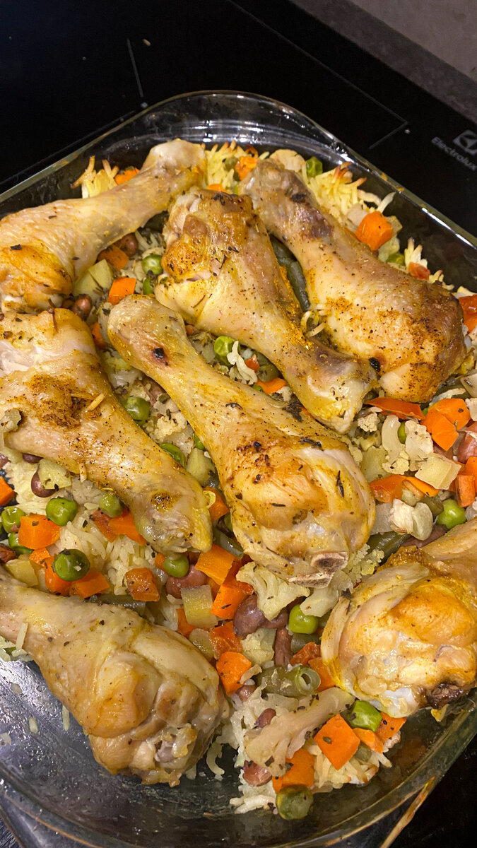 - Моем куриные голени. Валяем их в специях и выкладываем сверху на овощи.