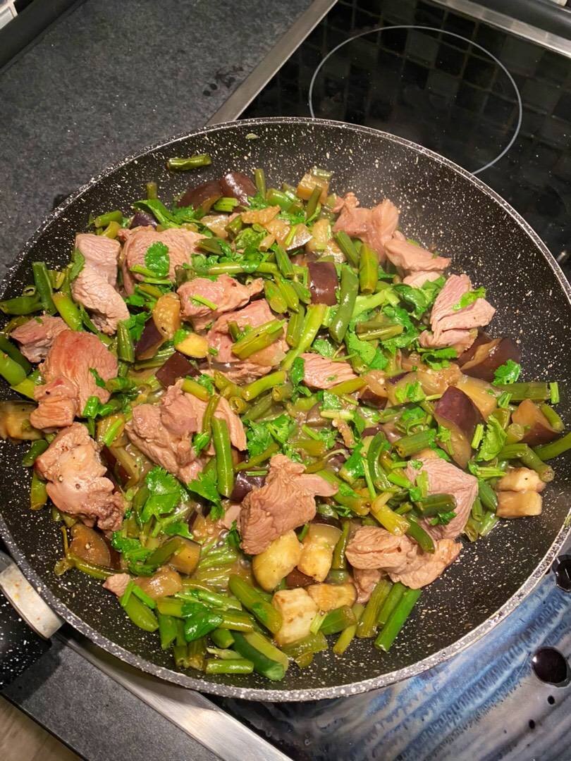 Быстрый и полезный ужин для тех, кто следит за фигурой Ингредиенты: Бедро индейки, Замороженная стручковая фасоль, Баклажан небольшой, сливочное масло, кинзы, соус Терияки Способ приготовления: Режем бедро индейки на средние кусочки, слишком маленькими их делать не нужно. На разогретом сливочном масле обжариваем индейку до появления небольшой золотистой корочки (сильно передерживать не нужно) Пока индейка обжаривается, режем баклажан кубиками и добавляем к индейке. Через 3-4 минуты добавляем фасоль. Через 2 минуты добавляем Терияки, все хорошо перемешиваем, солим и перчим. Если у вас фасоль была разморожена не до конца, воду можно не добавлять. Если разморожена - добавить немного горячей воды. Накрываем крышкой и тушим все вместе 10-15 минут. Зависит от того, какой прожарки мясо вы любите. Через 10 минут оно становится средней прожарки. Все! Приятного аппетита❤️
