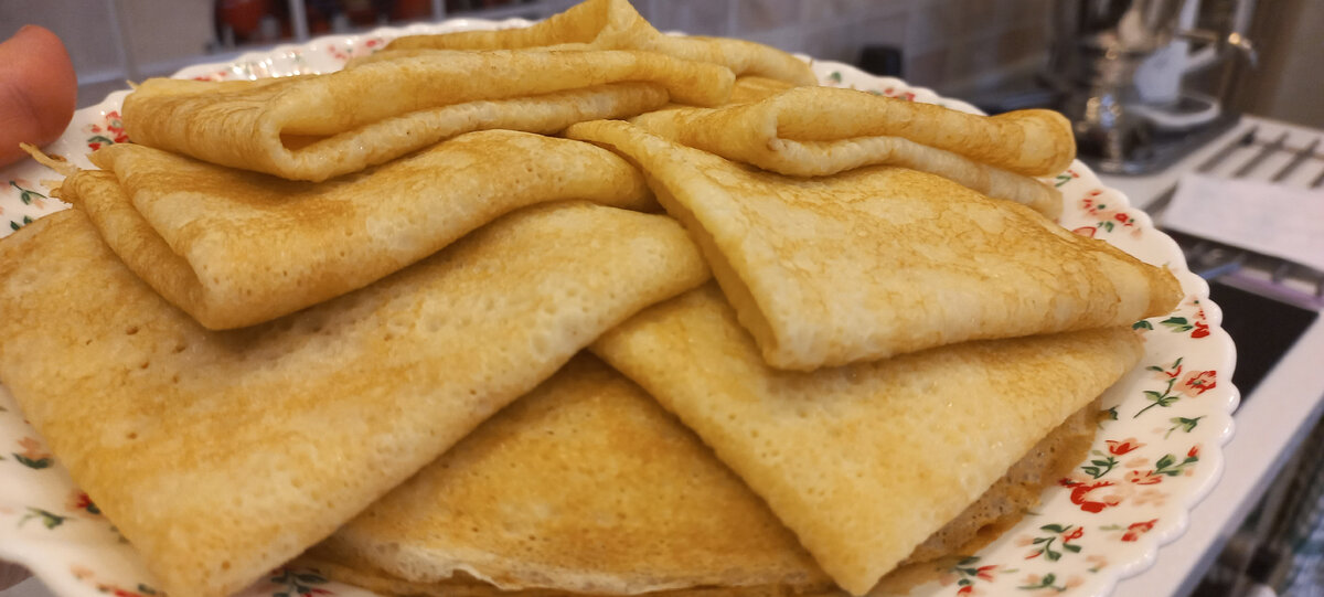 Ингредиенты: Мука-1,5 стакана (220гр) Молоко-2 стакана (400мл) Вода (кипяток)- 1 стакан (200мл) Яйца - 3 шт Сахар- 3 ст.ложки Масло растительное -3ст.ложки Соль 1/2ч.ложки Яйца нужно слегка взбить Добавляем Соль и сахар Постепенно добавляем муку Добавляем ещё 1 стакан тёплого молока Блины я жарю на среднем огне. Получаются очень нежные и тонкие Приятного аппетита!