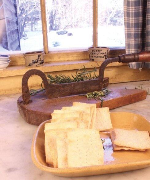 Эти крекеры долго хранятся и всегда хороши с чаем. Таша держала крекеры в большой старой красной жестяной банке из-под чая на главной кухонной стойке рядом с ящиком для специй и выносила их на чаепитие, обед, а в течении дня ели между приемами пищи с ветчиной. Тесто можно нарезать на квадраты, вырезать формочками для печенья или сформировать из него небольшие шарики и тонко раскатать. Важно раскатать их до 2–0,5 сантиметра и не добавлять слишком много крупной соли. Несмотря не то, что этот рецепт полезен только для приготовления крекеров, большинство теста для хлеба, раскатанное и выпеченное, также может превратится в крекеры.