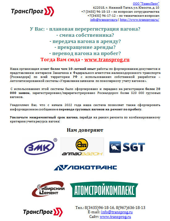 Аренда вагонов, документы для перерегистрации и другие услуги от ООО "ТрансПрог" ООО "ТрансПрог" 622018, г. Нижний Тагил, ул. Юности, д. 10 +7 (3435) 96-18-13 – по вопросам сотрудничества +7(3435) 96-17-12 – по техническим вопросам info@transprog.ru | http://www.transprog.ru/ У Вас: - плановая перерегистрация вагона? - смена собственника? - передача вагона в аренду? - прекращение аренды? - перевод вагона на пробег? Тогда Вам сюда - www.transprog.ru Наша организация имеет более чем 10-летний опыт работы по формированию документов и представлению интересов Заказчика в Федеральном агентстве железнодорожного транспорта (Росжелдоре) по всей территории РФ с использованием собственной разработки – Автоматизированной системы «Управление заявками по пономерному учету вагонов». С использованием этой системы было сформировано и передано на регистрацию более 20 000 заявок, зарегистрировано/перерегистрировано Росжелдором более 520 000 грузовых вагонов. Уведомляем Вас, что с начала 2022 года наш