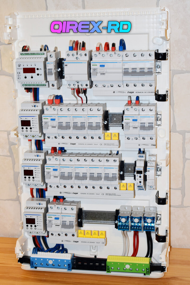 Несмотря на визуальную простоту и некую экономию (простой бокс Hager Golf), этот щит все же довольно продвинутый. Как видите, он "гибридный", содержит в себе как три однофазные секции, так и одну полноценную 3-х фазную.