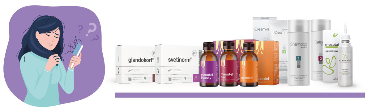 Наружный «Мезотель для кожи головы», шампунь и бальзам серии SPA LINE также стоит добавить в процесс комплексного восстановления волос. Средства отлично дополнят внутреннюю пептидную поддержку организма: помогут качественно и количественно сохранить ваши волосы.