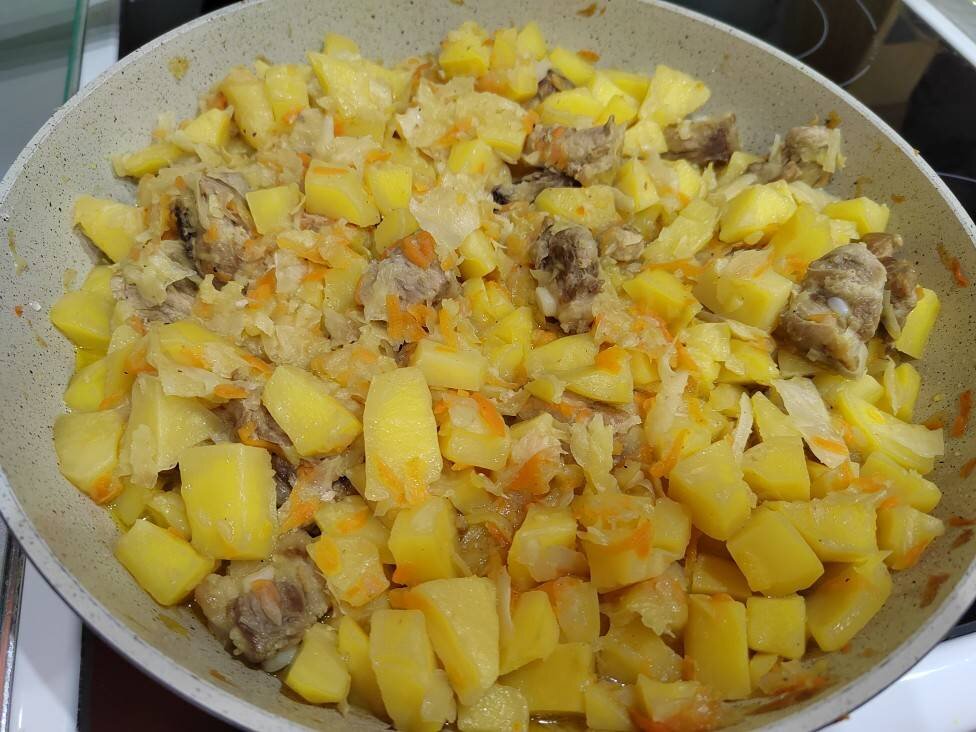 #обед Ингредиенты: Мясо, Картофель, Свежая капуста, Морковь, Соль, приправы, Вода Способ приготовления: В глубокой сковороде обжариваем мясо до полуготовности, подсаливаем. Капусту шинкуем и добавляем к мясу, обжариваем на среднем огне до полуготовности капусты. Картофель чистим, нарезаем кубиками и добавляем к мясу с капустой. В это время морковку обжариваем на сковороде и тоже добавляем к картофелю. Солим, добавляем специи и хорошо перемешиваем. Заливаем водой примерно на половину, закрываем крышкой и ставим на медленный огонь на 30-40 минут.