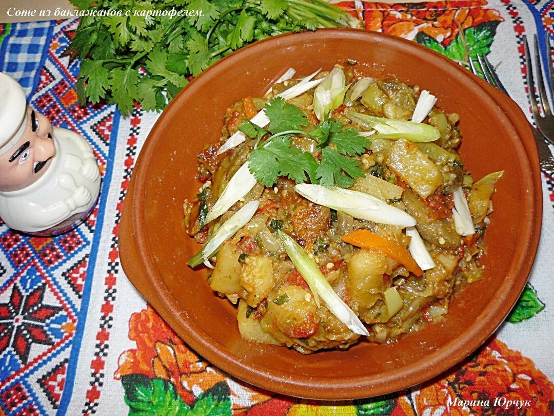 #пост Соте из баклажанов не требует серьезных кулинарных навыков. Готовится быстро и просто, а результат, как правило, превосходит все ожидания. У вас получится аппетитное, вкусное овощное блюдо, которое с легкостью займет достойное место в числе любимых. По правилам, готовится такое блюдо без картофеля. Но нам больше нравится, когда картофель присутствует. Ингредиенты: - баклажана, - картофель, - помидора, - репчатый лук, - болгарский перец, - моркови, - чеснока, - зелень петрушка, кинза, - масло для жарки, соль, приправы Способ приготовления: Сначала нарезаем баклажаны кружочками (толщиной 1 см), выкладываем на блюдо и солим. Оставляем на минут 10, чтобы выделилась горечь. После промыть баклажаны и дать стечь воде. Подсохшие баклажаны нарезаем соломкой. Картофель и все овощи нарезаем также соломкой. Чеснок и зелень – мелко. Ставим сковороду на огонь, нагреваем и наливаем растительное масло, ложек 5. Начинаем выкладывать овощи. Сначала идет картофель. Жарится до полуготовности. Затем