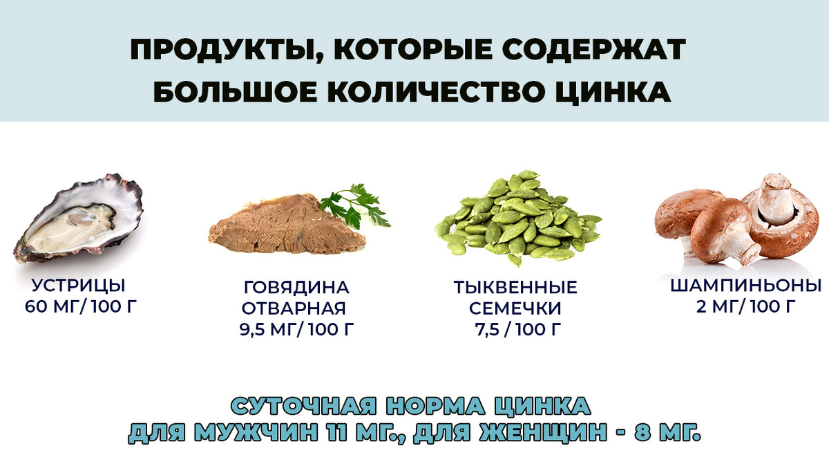В период простудных заболеваний очень важно повышать свой иммунитет, чтобы он боролся с вирусами и защищал организм. В этом может помочь цинк который является составной частью клеточного иммунитета( Zn ) и помогает бороться с вирусными инфекциями.⠀⠀⠀⠀⠀⠀ ⠀⠀⠀⠀⠀⠀ Какие ещё состояния профилактирует Zn? - Цинк участвует в "стабильности" такого важнейшего гормона как инсулин, а потому профилактирует инсулинорезистентность, сахарный диабет II типа и ожирение . - половые дисфункции, нарушение сперматогенеза( так как участвует в синтезе тестостерона). - проблемы с волосами (выпадение , ломкость , их истончение), ногтями ( ломкость ), кожей ( сухость, шелушение, покраснение, плохое заживление ран). - Цинк оказывает бактерицидный, бактериостатический и противогрибковый эффект.⠀⠀ Суточная потребность цинка составляет 12-15 мг, а в период обострения ОРЗ может достигать 70 мг.⠀⠀⠀⠀⠀⠀ В каких продуктах больше всего цинка?⠀⠀⠀⠀⠀⠀ В пище больше всего цинка (Zn) содержится в устрицах, а также в куриной, г