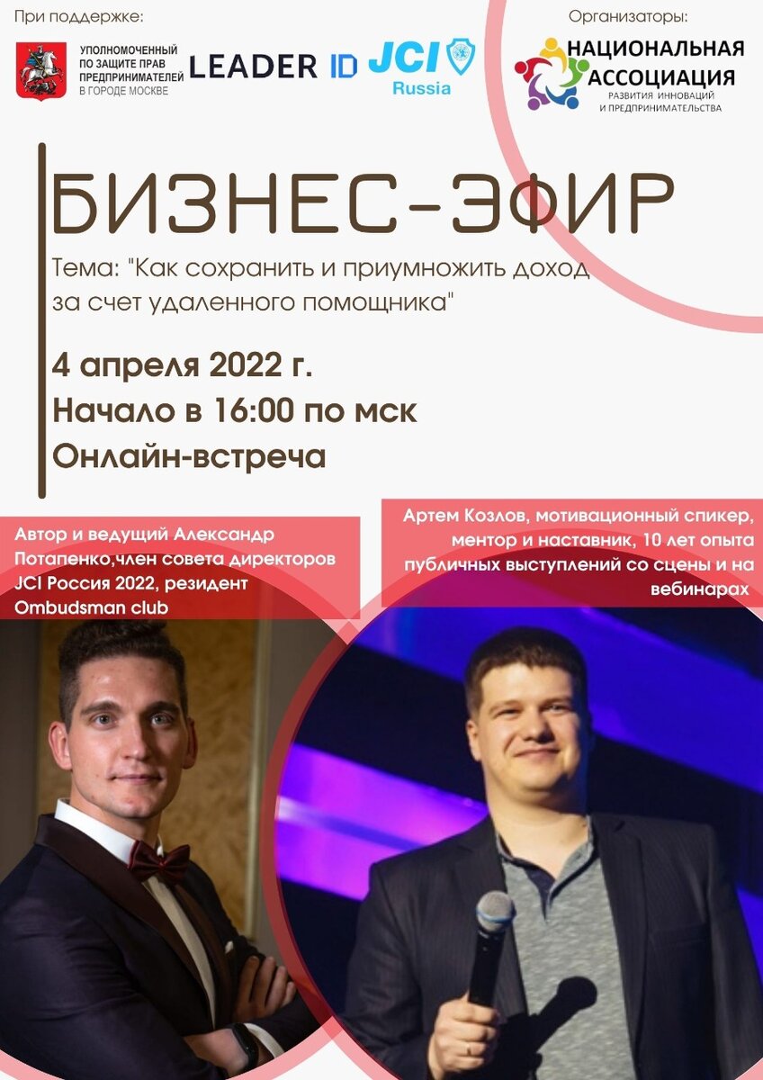 Приглашаем на Дело! Бизнес - эфиры "Дело" - авторская программа Александра Потапенко про бизнес, предпринимателей, прибыльные идеи, стартапы, деньги, инвестиции и технологии. Ближайший бизнес - эфир: "Как сохранить и приумножить доход за счет удаленного помощника". Старт 4 апреля в 16:00 (МСК). Организаторы и партнеры: 📌Команда бизнес - омбудсмена Москвы. 📌Международная молодежная палата JCI Россия. 📌Координатор общественных представителей АСИ Москвы по направлению «Предпринимательство и технологии» Алексей Мостовщиков. 📌Член Комитета Торгово-промышленной Палаты РФ, исполнительный директор Национальной Ассоциации развития инновации и предпринимательства Александр Потапенко. Бизнес- эфиры организованы для предпринимателей, лидеров и руководителей бизнеса в России. В рамках эфиров спикеры поделятся антикризисными решениями, новыми возможностями для бизнеса в современных реалиях, новыми решениями в бизнесе, а также ответят на самые интересные вопросы зрителей. 📌Темы эфиров: - финанс