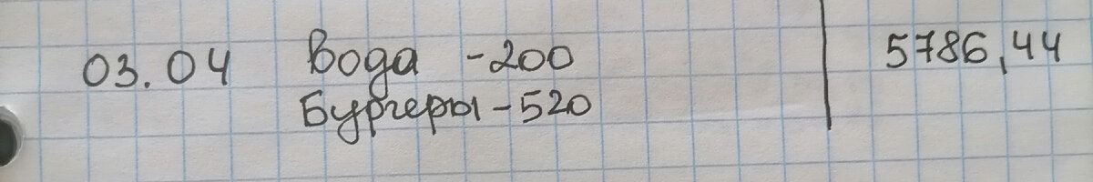 Немного припозднилась с отчётом за день, но лучше поздно, чем никогда😅 Итак за 3 апреля было потрачено: 200рублей за 10 пятилитровых бутылок родниковой воды(её отвезли свекрови). Ну и захотелось немного побаловать себя вредняшкой, купили бургер и картофель фри и отдали за это 520 руб. Итоги за 3 дня:5786,44 руб.