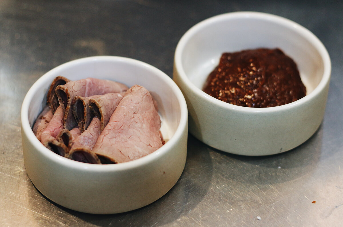РЕЦЕПТ ПРИГОТОВЛЕНИЯ ОТ ШЕФ-ПОВАРА МАКСИМА КЛЫКОВА - БРЕНД-ШЕФ КОРНЕРА "FARRO PASTA BAR" НА ГАСТРОНОМИЧЕСКОЙ УЛИЦЕ STREAT 2 порции | 640 гр | 253 ккал на 100гр Ингредиенты: Спагетти черные – 125 гр Ростбиф слайсами – 50 гр Сливки 33% – 30 мл Куриный бульон – 60 мл Для соуса: Чеснок – 100 гр Лук шалот – 100 гр Черный перец – 20 гр Соевый соус- 100 гр Чеснок, лук шалот, соевый соус пробиваем в блендере до однородной консистенции. 1 этап · Вылить соус в холодную сковородку, добавить немного воды и размещать соус до однородной консистенции 2 этап · Вскипятить воду в сотейнике · Опустить пасту в воду · Варить 1 минуту 20 секунд, непрерывно помешивая 3 этап · Добавить отваренную пасту в соус с ингредиентами · Дать ей немного провариться в соусе, в конце добавить ростбиф и перемешать 4 этап · Выложить пасту на тарелку ПРИЯТНОГО АППЕТИТА!