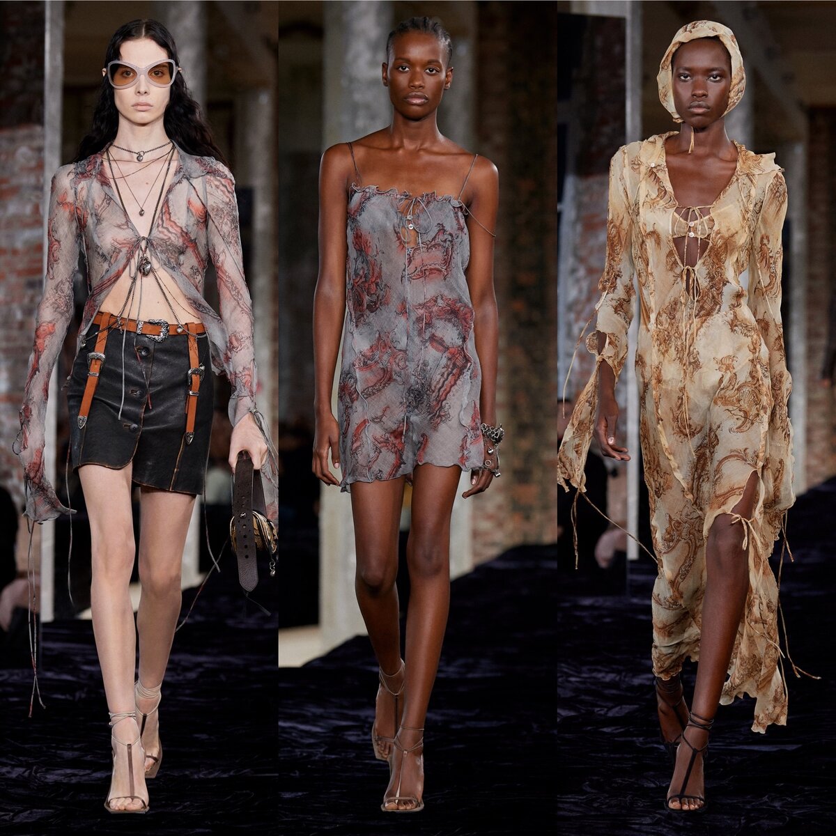 Acne Studios SS’22 RTW, как и большинство коллекций этого сезона, ознаменовала собой окончательный выход из плена такой уютной, но лишенной каких-либо признаков моды, домашней и спортивной одежды. Первые несколько образов дают сразу же понять, что Джонни Йоханссон сделал ставку на бельевой стиль, а значит, 90-е так или иначе себя проявят. Весьма благодатный период для моды, надо сказать. Секси блузочки, шнурочки, мини платьица и юбочки на пуговицах, а также платья-комбинации в сочетании с огромными платформами. Это было безумно круто, кто помнит? Забавно, что прошлая коллекция Йоханссона навевала мысли об одеялах и уютных пледах, в которые хочется срочно укутаться, особенно, осенью. Тогда как нынешняя коллекция скорей предлагает обнажиться по максимуму, но в условиях бельевого стиля, который очень привлекает дизайнера. Проснулась так, одеялко откинула… и уже готова. Удобно. Будуарная тема по понятным причинам выглядит чувственно и сексуально. Подвязки и корсеты, гольфы на шнуровк