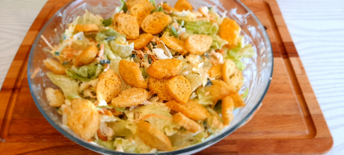 Сегодня с вами хочу поделиться своим любимым салатом.Готовится он очень легко и быстро. Однажды приготовив такой салат вы его полюбите и он появится на вашем столе. ИНГРЕДИЕНТЫ: 1.Куриная грудка- у меня 700 гр. 2.Корейская морковь - 350гр. я беру со спаржей всегда - она более нежная. 3.Салат листовой в горшочке- 1 штука. Я иногда заменяю на салат айсберг. 4.Огурец длинный - 1 штука. 5.Сухарики 1 упаковка.Лучше использовать белые, мягкие. 6.Соль по вкусу. 7.Майонез для заправки. Сначала отварите куриную грудку в подсоленной воде. Далее остудите готовую куриную грудку.Можно нарезать кубиками или просто разделить на волокна. Вымойте салат и осушите его бумажным полотенцем. Выбирайте емкость для салата глубокую. Нарвите салат руками так вы придадите объём салату и листья не станут мягкими. С корейской морковки слейте всю жидкость. Огурец помойте и нарежьте соломкой. Сложите все вместе в глубокой ёмкости. Посолите по вкусу.Заправить майонезом и сверху положить сухарики. Приятно