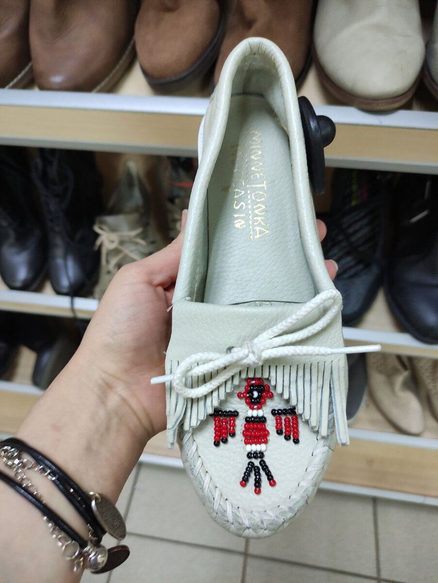 Джинсы, сумки и фотоаппараты. Всем привет! Меня зовут Ирина, добро пожаловать на мой канал! ---------------------- Сегодня обзор из секонд-хенда на скидке 20%. Нашла интересные вещи, обувь и сумки. Сразу начну с супер находки чудесных мокасин от легендарного бренда "Minnetonka" ↓ Это американская фирма обуви, которая занимается производством очень удобных неформальных мокасин с 1946 года. Вся их обувь произведение искусства в своем стиле и очень удобная. Мокасины в светлом оттенке серого цвета выполнены из натуральной кожи. Аутентичный декор в виде фигурной бахромы и вышивки бисером – этническая птичка. Такие они хорошие! Я в поисках сокровищ от этого бренда. К сожалению, эти мокасины оказались маленького 35 размера. Они были в новом состоянии. Стоимость со скидкой 1480р. ---------------------- Ещё одни мокасины в сером цвете из натуральной кожи ↓ Эти уже несколько поношенные, но в прекрасном состоянии. Обратите внимание – как ортопедично сделана подошва. В общем, рабочая лошадка для
