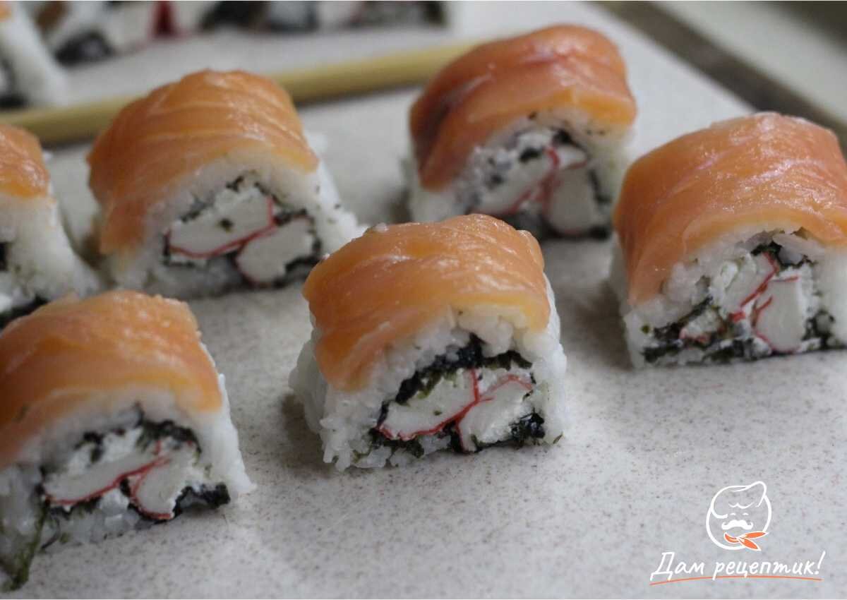 Роллы – это вкусная закуска из рыбы, которую можно приготовить и дома. Данный рецепт схож с классическими роллами «Филадельфия», однако в начинке вместо огурца используется снежный краб. Вы можете заменить этот компонент на авокадо или свежий огурец. Энергетическая ценность на порцию Сложность рецепта: Ингредиенты: Из расчета на 1 ролл Рецепт приготовления: Шаг 1 Сперва нужно выложить охлажденный вареный рис на нори, как показано на фото. Шаг 2 Перевернуть нори рисом вниз. Смазать сыром, выложить крабовые. Шаг 3 Свернуть ролл циновкой. Шаг 4 Выложить рыбу и еще раз свернуть ролл. Шаг 5 Домашние роллы готовы! Приятного аппетита! *********************************************************** Подписывайтесь на канал, ставьте лайки и пишите комментарии! Самые вкусные и простые пошаговые рецепты с фото только на Дам рецептик! *********************************************************** Не забудьте посетить наш сайт Дам рецептик! Простые рецепты в домашних условиях пошагово с фото. Самые вкусные