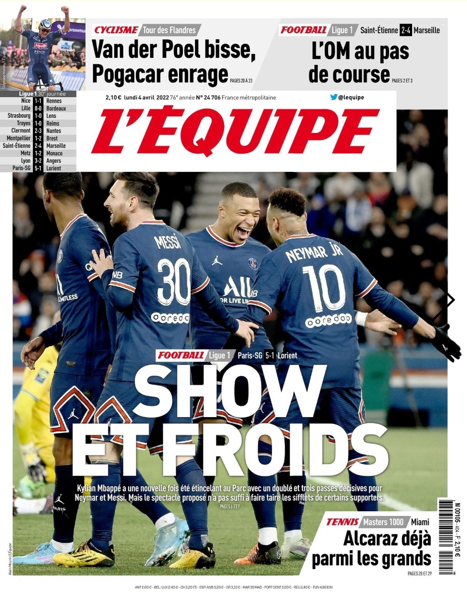 «Шоу и холод» Килиан Мбаппе снова блистал на «Парк де Пренс», затмив всех своих звёздных одноклубников. На счету у француза 2 гола и 3 ассиста, но всего этого оказывается недостаточно, чтобы унять свист болельщиков, которые недовольны поведением Мбаппе. После матча француз ответил на ряд вопросов о своей ситуации. 🎙Ты принял решение о своём будущем? «Нет. Я ещё не решил. Я спокоен. Я не хочу торопиться, потому что я не хочу ошибиться. Думаю, потому что появились новые детали, много всего и новые параметры» 🎙Какие новые детали? «Есть много ньюансов, которые нужно учитывать. Я стараюсь видеться с моими родственниками, чтобы принять лучшее решение» 🎙Не торопиться — хороший знак для «ПСЖ»? «(Пожимает плечами) Честно говоря, не знаю. Иметь любовь людей здесь всегда было приятно. Я благодарю их за это. Целый стадион кричит твое имя, это не просто так» 🎙Остаться в ПСЖ, возможно ли это? «Ну конечно; естественно» 🎙Ты всегда хотел стать лучшим игроком в мире. Как ты думаешь, ты сего