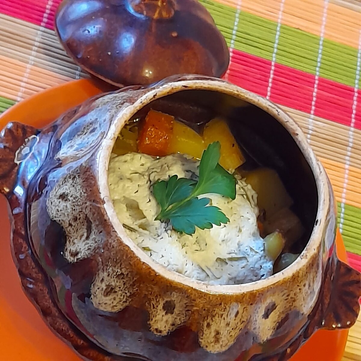 Мясо с овощами в горшочках В Древней Руси блюда готовили в горшках в русских печах. Это были сочные ароматные блюда, собирающие в унисон все вкусовые нотки продуктов участвующих в процессе томления. Но не стоит забывать традиционную русскую кухню из-за невозможности приготовления блюд в печи. Печи мы заменили духовками, а горшки – горшочками. Состав блюда вы можете менять, добавлять по своему усмотрению. Как мясо и овощи, так и приправы. Сегодня предлагаю приготовить древнерусское блюдо с минимальным составом. Ингредиенты на 2 порции: Говядина – 300 гр.; Морковь – 1шт.; Лук – 1 шт.; Картошка – 300 гр.; Бульон говяжий – 1 кубик на 300 мл. горячей воды; Сливочное масло – 100гр; Перец горошек. Соус: Чеснок – 2 зубчика; Петрушка – 20 гр.; Сметана 20% - 4 ст. ложки. Приступаем: Мясо режим кубиками 2,0 х 2,0 см и обжариваем на предварительно раскаленной сковороде в сливочном масле, перчим, солим (умеренно, т.к. в бульоне тоже присутствует соль). Мясо не должно зажариться, только прихватиться