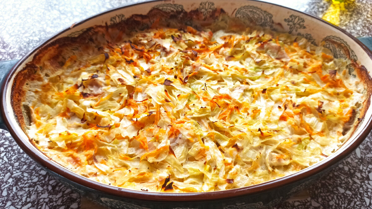 Калорийность этого блюда всего 53 ккал на 100 граммов, на его подготовку к запеканию я трачу всего 10-15 минут своего времени. Остальное делает духовка. Я частенько его готовлю на ужин, мне оно очень нравится. Это сливочная капуста запечённая в духовке. Это очень вкусное блюдо, которое всегда меня выручает, когда мне нужно сбросить пару лишних килограммов после зимы. Его без усилий можно адаптировать под любые вкусы и предпочтения. Муж ест эту капусту вместе со мной, только для него отдельно отвариваю картофель или рис, чтобы было сытнее. Примерные пропорции вы сможете найти в первом комментарии под статьёй. Шаг 1 Начинаю с того, что режу соломкой капусту. Если капуста молодая, то её достаточно залить кипятком и оставить на 3-5 минут. Если капуста зимняя и грубоватая, то отварите её примерно 1 минуту. Шаг 2 Пока капуста находится в кипятке, я чищу морковь и лук. Лук нарезаю мелким кубиком, морковь натираю на крупной тёрке. Шаг 3 Откидываю капусту на дуршлаг, соединяю с морковью и луко