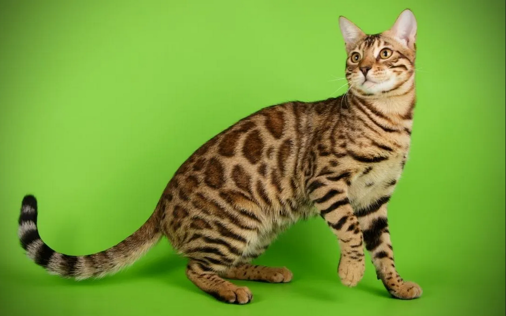 Если и есть какая-то порода, известная своим окрасом - то это бенгальская кошка. Наиболее узнаваемый цвет и рисунок на шерсти - это золотистый фон с красивыми, похожими на леопардовые, черными розетками. У этих кошек зеленые, желтые или золотистые глаза. Кошки бенгальской породы, как правило, среднего или крупного размера весом 2,7-6,8 кг. У них дикий вид с длинными, хорошо обмускуленными ногами и толстым хвостом.