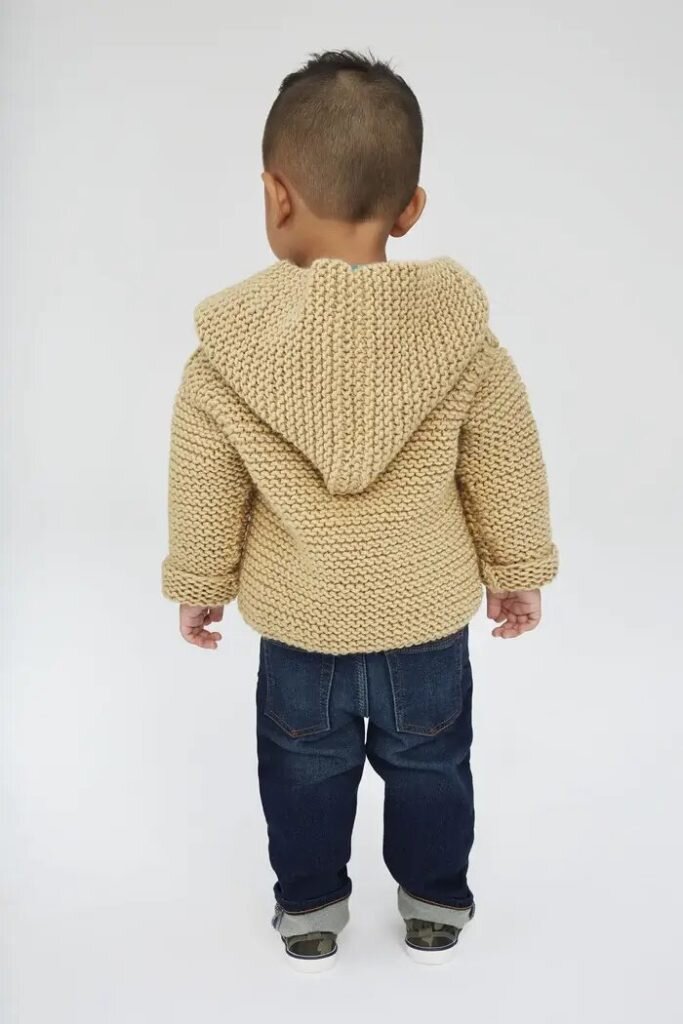 Вязаный жакет Тейлора для прохладных деньков вяжется из толстой пряжи и подходит для начинающих вязальщиц. Подготовка к вязанию детского жакета "Taylor's Jacket" Материалы Плотность вязания 12 петель/26 рядов (10 см/10 см – платочная вязка. Прежде чем приступать к работе над детским жакетом "Taylor's Jacket", обязательно проверьте плотность вашего вязания на образце не менее 10х10 см. В случае, если петель и рядов больше, чем указано, попробуйте использовать более толстые спицы. Если петель и рядов меньше, чем указано, возьмите более тонкие спицы. Размеры 6 месяцев (1 год; 2-3 года; 4 года) Обхват груди изделияДлина изделия6 месяцев51 см24 см1 год54,5 см25,5 см2-3 года58,5 см28 см4 года65 см30,5 см Обозначения kfb (убавить 1 п.) – вязать следующую петлю лицевой и не снимая ее провязать еще одну лицевую петлю за заднюю стенку. Описание вязания детского жакета "Taylor's Jacket" Жакет состоит из 4 частей: тело, 2 рукава и капюшон. Все части вяжутся платочным узором. Тело Набрать 60 (64;