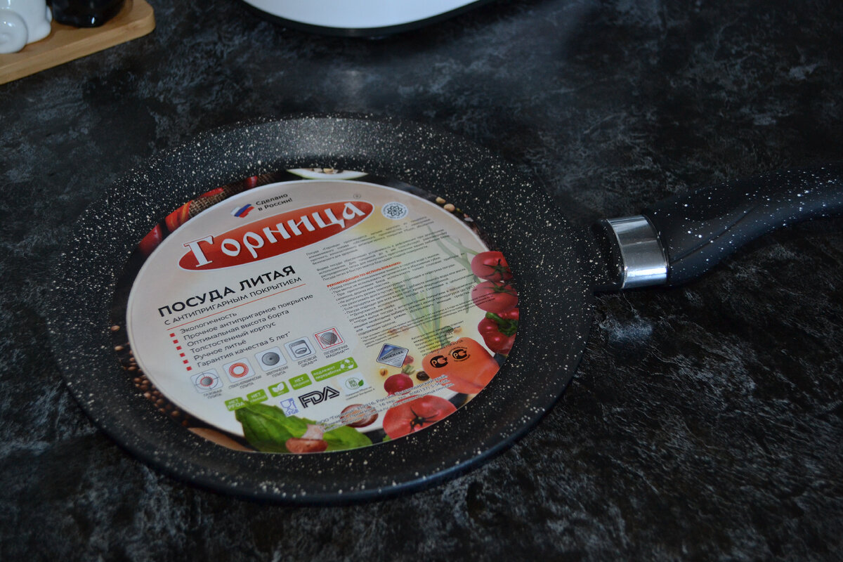 Всем привет! Буквально недавно купила на базаре себе новую сковороду для блинов, так как моя старая стала уже совсем не способна печь красивые тонкие блинчики. На базарчике мне посоветовали купить нашу советскую сковороду фирмы Горница, стоимостью 800 рублей. Продавщица сказала уверила что у нее этой фирмы все кастрюли и сковороды. Я конечно же понимала она продавец ей нужно продать, а я всего лишь покупатель. Но все же решила я ей довериться, купила. На фото выше моя первая сковорода. Естественно не удержалась на следующий день приготовила тесто для блинчиков и сразу же печь. Моей радости небыло придела, к ней реально ничего не прилипает, блины легко снимаются даже без растительного масла. Продавец меня не обманула. Спустя неделю, когда поехали к сыну в гости, а он живет в другом населенном пункте, купила себе еще одну, правда уже за 900 рублей :)) Сковорода имеет привлекательный дизайн под мрамор, такое покрытие как внутри, так и снаружи модели. Сковорода не слишком тяжелая. Дно