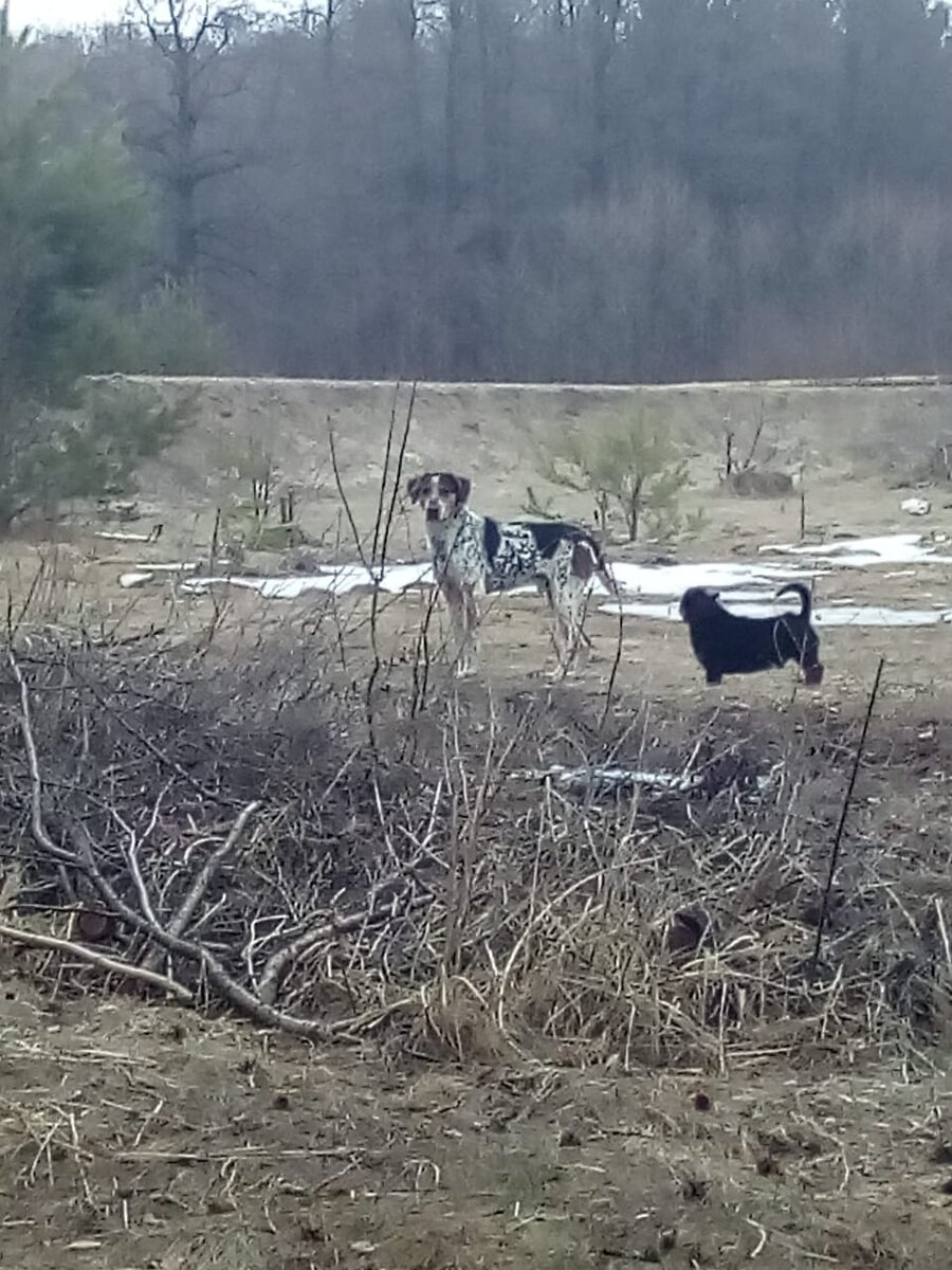 Туманное утро началось с несусветного лая за забором моего двора. К праведному гневу моего песика примешивалось оправдательное уханье более крупного зверя. Почуяв неладное, я поспешила на задний двор, открыла калитку. Так и есть: мой Джойка старательно гонит от забора крупную и красивую охотничью собаку. Нарезая дуги, выжимает противника по кривой, словно окашивает луг косой. И хотя Джойка раза в три мельче противника, он наступает. Тем более он тоже у меня наполовину такса, это особенно было заметно в щенячьем возрасте. Охотничий пес уходить не хочет и, как ни странно, боится зубов моего верного стража, хотя тоже скалит зубы в ответ и пытается ухватить Джойку за бок. Подняв обломок сосновой ветки, я со свистом кинула ее в сторону собак, чтоб разбежались. Обе остановились, замолчали и смотрели на меня. Тут я их и сфотографировала. Большой пес потерял интерес к выпадам Джойки и устремился ко мне, всем своим видом показывая, как он меня любит, только дай поесть. Джойка угадал, что я выш