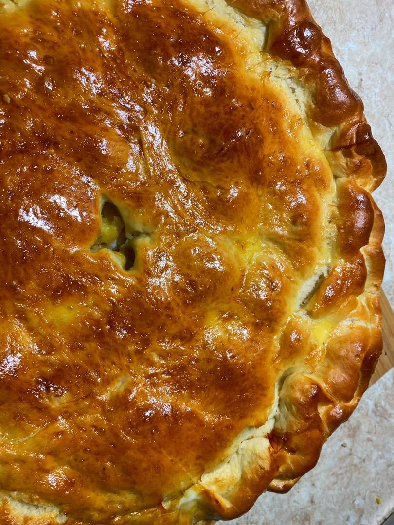 Ингредиенты: Тесто:, - Мука, - Соль, - Молоко, - Масло сливочное (размягченное), - Дрожжи (быстродействующие), - Сахар, - Яйцо, Начинка «Курица и картошка»:, – Фарш говяжий, – Картофель сваренный в мундире, - Лук, Соль и перец , Для смазывания:, – Яйцо, – Молоко Способ приготовления: Молоко подогреть так, чтобы оно было чуть теплее человеческого тела, но не горячее. Добавить к нему сахар и дрожжи. Перемешать и дать постоять минут 10. В миску с мукой добавить яйцо и соль. Перемешать. Влить дрожжевую смесь и размягченное сливочное масло (именно размягченное, выньте его из холодильника заранее). Замешайте тесто. Оно должно впитать всю муку, не липнуть к рукам. Даем постоять около 2,5- 3 часов. При этом через 1 час опускаем его рукой. Место, где подходит тесто должно быть теплое и без сквозняков. Я кладу его в выключенную духовку. Для начинки картофель и лук нарезать кубиком. Обжарить лук и фарш до готовности. Полностью остудить. Смешать фаршу, картошку и посолить по вкусу. Когда тесто под
